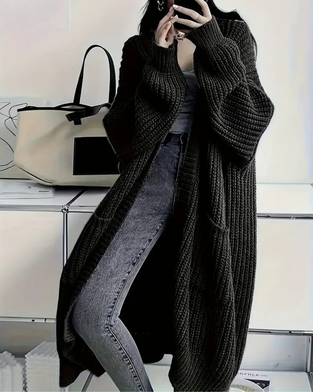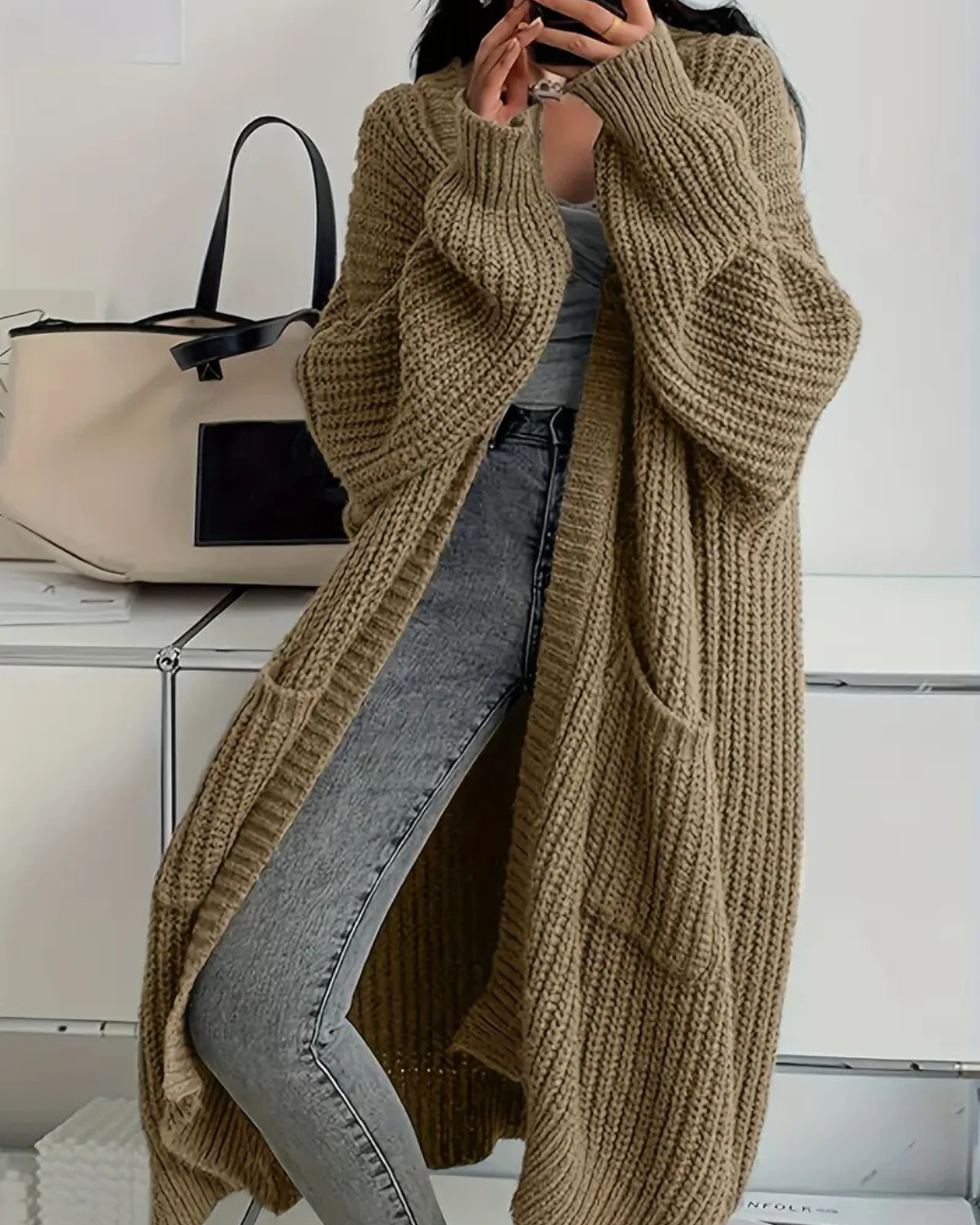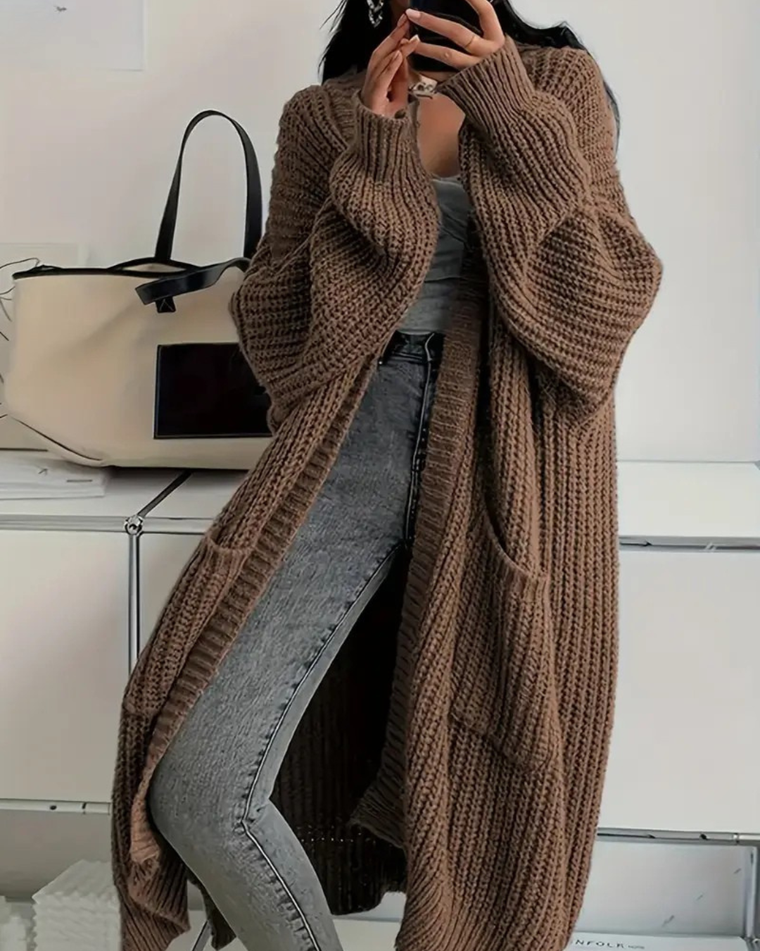 Abrigo largo para mujer con estilo abierto y bolsillos frontales