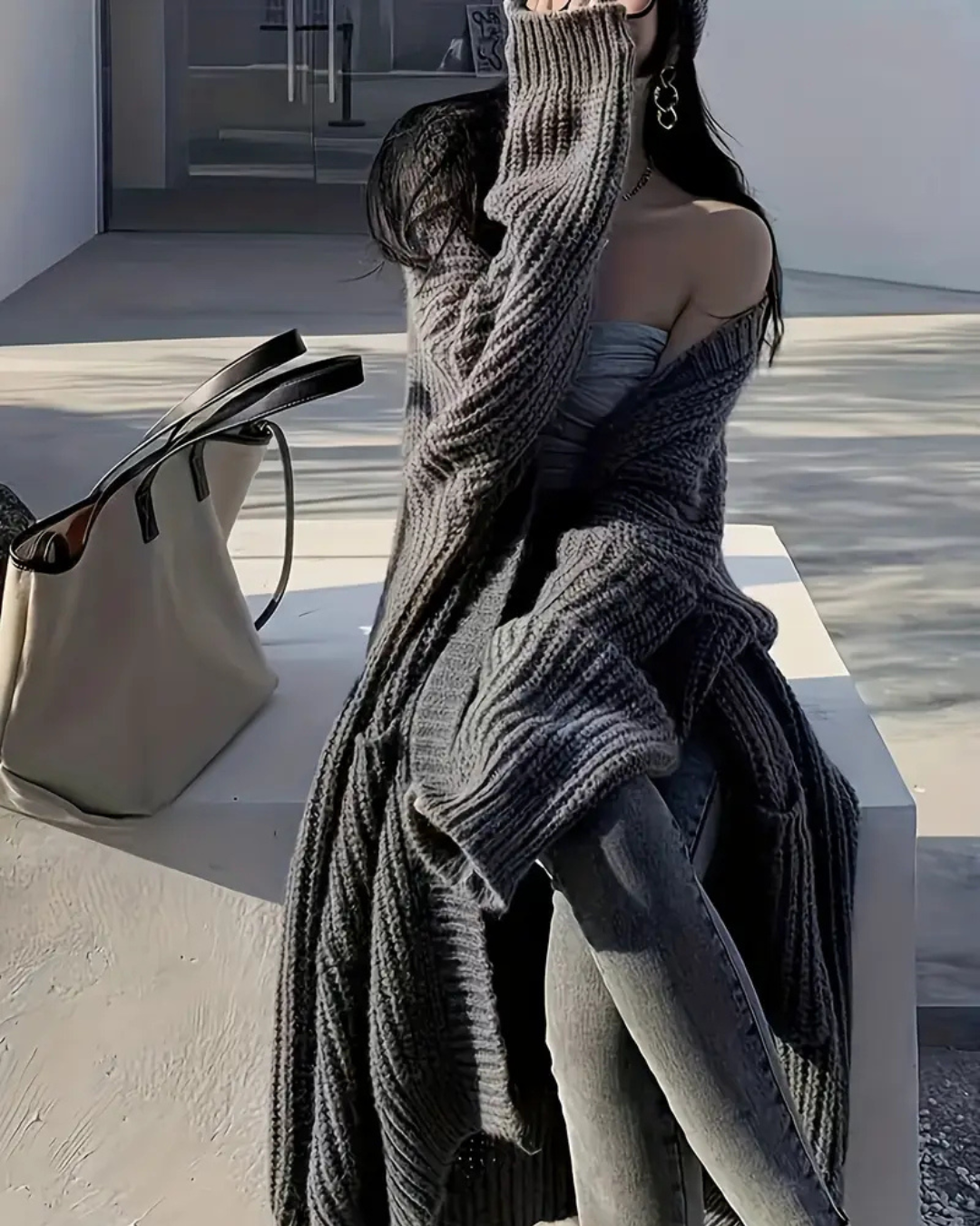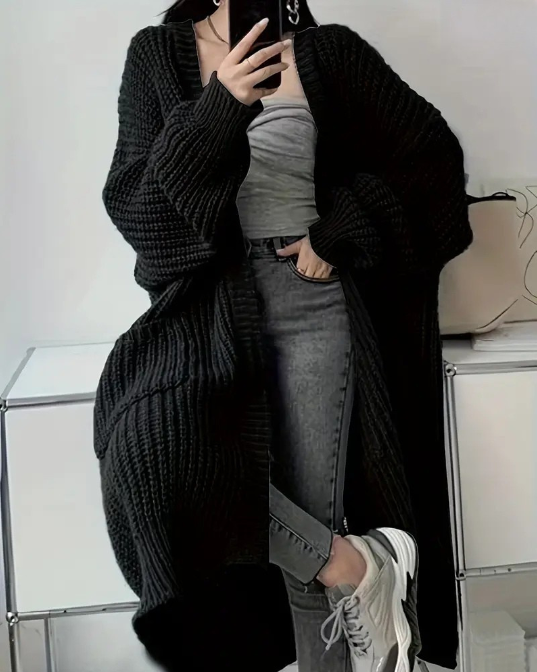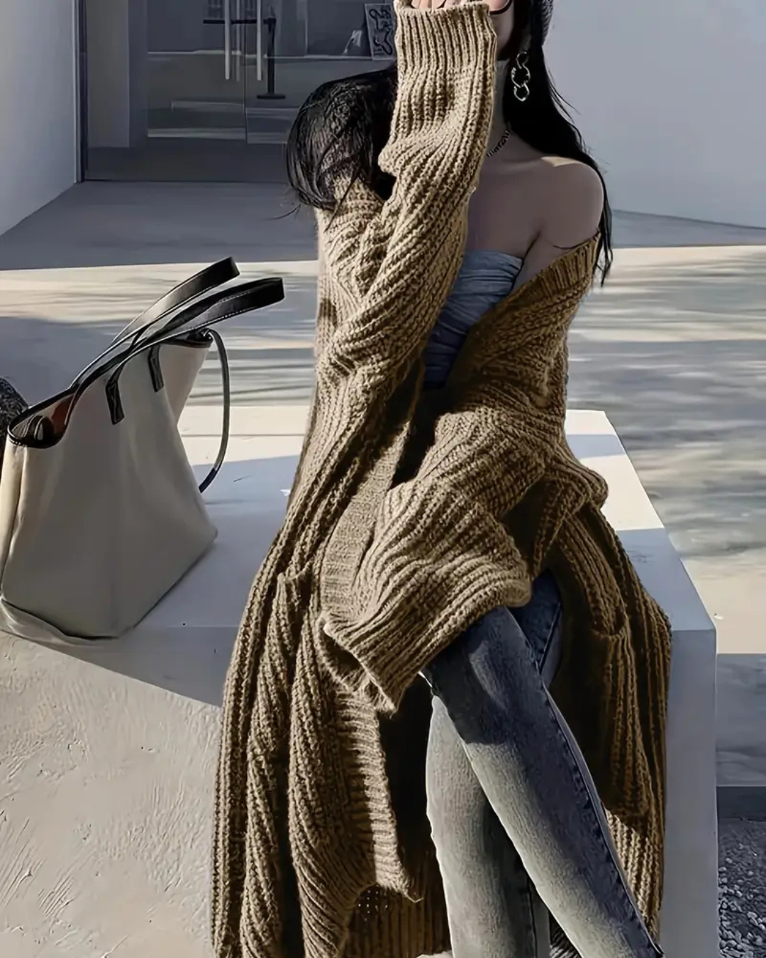 Abrigo largo para mujer con estilo abierto y bolsillos frontales