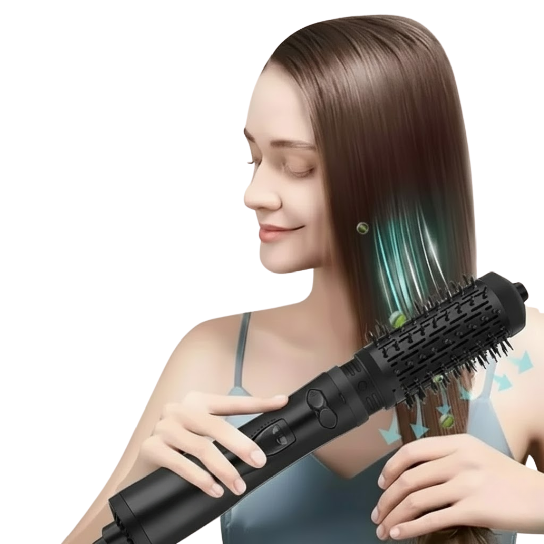El cepillo ofrece tres niveles de calor (templado, caliente y frío) para adaptarse a diferentes tipos de cabello y necesidades de peinado. Además, su giro bidireccional le permite crear rizos naturales y movimientos con facilidad, profesionalizando su acabado en casa.