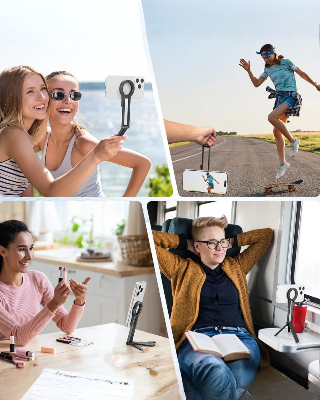 Concebido para creadores y usuarios activos, este accesorio cuenta con una estructura que se pliega de forma compacta. Cabe cómodamente en cualquier bolsillo o bolso pequeño, ofreciendo una estabilidad excepcional en cualquier lugar donde la inspiración lo encuentre.